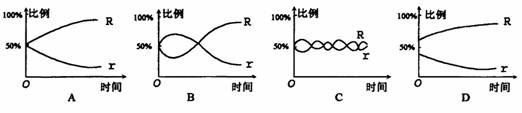 36.在某动物种群中,基因型RR占24%、Rr占72%、rr与4%。这三种基因型的个体在某一环境中的生存能力或竞争能力为:RR=Rr>rr。则在长期的自然选择过程中,下列能正确表示R和r基因频率变化的曲线是 ( )