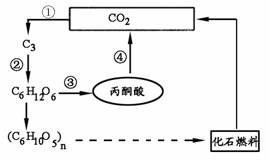 43.(8分)下图表示碳在无机环境和生物群落中的循环流动过程,请回答: