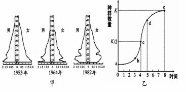 45.(8分)下图甲是依据我国3次人口普查数据,绘制的人口年龄组成图。图乙示某种群数量增长曲线图,请回答下列问题: