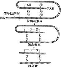 7.胰岛素是在胰岛B细胞中合成的,刚合成的多肽称前胰岛素原,在信号肽酶的作用下,前胰岛素原的信号肽被切除,而成为胰岛素原。最后胰岛素原通过蛋白酶的水解作用,生成胰岛素和一个C肽(如图);前胰岛素原水解所需的水中的氢用于 ( )