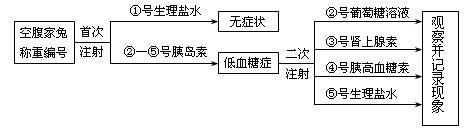 C.在二次注射后,由于家兔的下丘脑也可通过有关神经的作用,使肾上腺和胰岛A细胞分泌肾上腺素和胰高血糖素,从而使血糖含量升高,所以⑤号兔与③④兔的表现症状相同