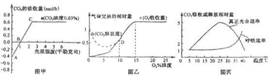 (4)依据上图数据分析,蹦大棚种植蔬菜时,白天应控制光强为甲图中 点对应的光照强度,温度为丙图中 ℃最佳。储存蔬菜时氧气的浓度应为 %。
