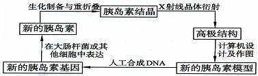 胰岛素可以用于治疗糖尿病,但是胰岛素被注射入人体后,会堆积在皮下,要经过较长的时间才能进入血液,而进入血液的胰岛素又容易分解,因此治疗效果受到影响。下图是用蛋白质工程设计的速效胰岛素的生产过程,请据图回答有关问题: