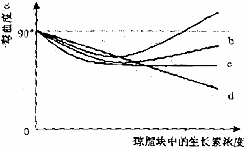 5.某研究小组探究避光条件下生长素浓度对燕麦胚芽鞘生长的影响。胚芽鞘去顶静置一段时间后,将含有不同浓度生长素的琼脂块分别放置在不同的去顶胚芽鞘一侧,一段时间后测量并记录弯曲度(α)。左下图为实验示意图。右下图曲线中能正确表示实验结果的是
