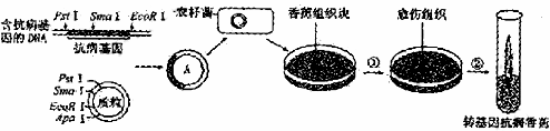 转基因抗病香蕉的培育过程如图所示。质粒上有PstⅠ、SmaⅠ、EcoRⅠ、ApaⅠ等四种限制酶切割位点。请回答: