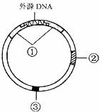 (4)紫花形成的生物化学途径中,若中间产物是红色(形成红花),那么基因型为AaBb的植株自交,子一代植株的表现型及比例为: 。(5)紫花中的紫色物质是一种天然的优质色素,但由于B基因表达的酶较少,紫色物质含量较低。设想通过基因工程技术,采用重组的Ti质粒转移一段DNA进入细胞并且整合到染色体上,以促进B基因在花瓣细胞中的表达,提高紫色物质含量。下图是一个已插入外源DNA片断的重组Ti质粒载体结构模式图,请填出标号所示结构的名称