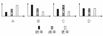 44、下列表示四种不同种群中不同年龄个体所占的比例,其中种群密度会越来越小的是( )