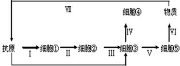 A、细胞②为B细胞 B、细胞⑤产生的物质为球蛋白