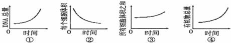 11.下图表示蛙的受精卵发育至囊胚过程中,DNA总量、每个细胞体积、所有细胞体积之和、有机物总量的变化趋势(横坐标为发育时间)。其中正确的是 ( )