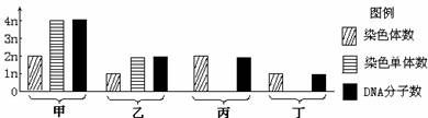 (2)下图中甲-丁为某动物(染色体数=2n)睾丸中细胞分裂不同时期的染色体数、染色单体数和DNA分子数的比例图,关于此图叙述中错误的是