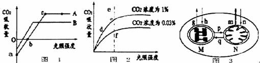 29.(17分)下列的图都与植物光合作用有关,图1表示A、B两种植物光合作用效率随光照强度改变的变化曲线;图2表示将A植物放在不同浓度CO2环境条件下,光合效率受光照影响的变化曲线:图3代表植物的一个叶肉细胞及其相关生理过程示意图。请据图回答: