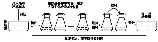 某化工厂的污水池中含有一种有害的难以降解的有机化合物A。研究人员用化合物A、磷酸盐、镁盐以及微量元素配制的培养基,成功筛选到能高效降解化合物A的细菌(目的菌)。实验的主要步骤如下图所示。请分析回答下列问题。