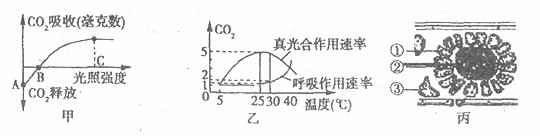 5.下图甲、乙、丙分别表示植物光合作用速率与光照强度之间的关系、温度与光合作用速率之间的关系及植物叶片的结构示意图。下列说法不正确的是 ( )