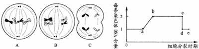 (3)在曲线图中,a-b段DNA含量发生变化的原因是 。在A、B、C三图中,与b-c段相对应的细胞是图 。