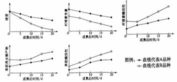 33.(9分)桃果实成熟后,如果软化快、耐贮运性就会差。下图表示常温下A、B两个品种桃果实成熟后硬度等变化的试验结果。