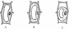 (4)若用洋葱的鳞片叶表皮制备临时装片观察质壁分离和质壁分离复原,将一张洋葱鳞片叶放在某一浓度的蔗糖溶液中,制成装片,放在显微镜下观察,发现有3种状态的细胞,如下图。你认为这3个细胞(均为正常的活细胞)在未放人蔗糖溶液之前,其吸水力大小关系为( )