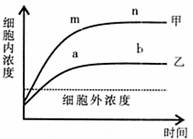 7.将某活组织放入适宜的完全营养液中,置于适宜的条件下培养。培养液中甲乙两种离子的浓度保持相等且恒定,定期测得细胞中两种离子的含量,得到如下图所示曲线,据图分析下列叙述中正确的是 ( )