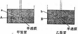 21.如图表示渗透作用装置图,其中半透膜为膀胱膜(蔗糖分子不能通过,水分子可以自由通过)。图中溶液A、B、a、b均为蔗糖溶液,其浓度分别用MA、MB、Ma、Mb表示,且MA>MB,Ma=Mb>MA。一段时间达到平衡后,甲装置、乙装置漏斗液面上升的高度分别为h1、h2,a、b的浓度分别为M1、M2,则 ( )