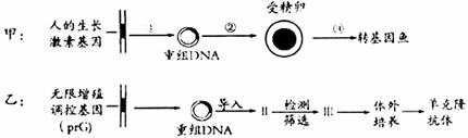 (2)乙图中prG能激发细胞不断分裂,科学家通过向某细胞内导入该调控基因来制备单克隆抗体,Ⅱ最可能是_______细胞,筛选出的Ⅲ细胞的特点是______________。