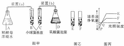 (1)实验一:小球藻在适宜条件下繁殖很快,在相同培养液中,以图甲中的装置(a)和(b)分别培养小球藻(抽去空气),将两个装置都放在阳光下,观察最初的变化: 装置(a)的B试管中小球藻繁殖速度比装置(b)的C试管中小球藻繁殖速度 (快、慢),请写出能解释此现象的两个主要化学反应式: