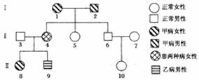 54.(10分)Ⅰ、下图是具有两种遗传病的家族系谱图,设甲病显性基因为A,隐性基因为a;乙病显性基因为B,隐性基因为b。若Ⅱ-7为纯合体,请据图回答: