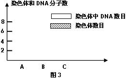 (4)请在图3坐标中的A、B、C处用直方图分别表示图2中甲、乙、丙细胞分裂过程中染色体数和染色体中DNA分子数目。