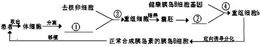 下图是利用现代生物工程技术治疗遗传性糖尿病(基因缺陷导致胰岛B细胞不能正常合成胰岛素)的过程设计图解,请据图回答: