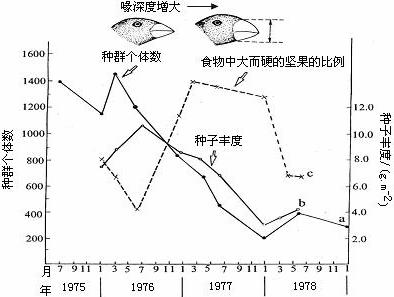19.加拉帕戈斯群岛地雀种群内,喙小的个体只适于食用小坚果,喙大的个体容易咬开大坚果,也食小坚果,但是取食速度较慢。从1976年-1978年该岛一直未下雨,引起地雀种群数量、食物组成变化如下图所示。1978年出生的地雀,喙平均增大4%。下列有关叙述错误的是 ( )