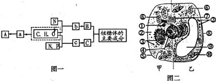 (2)图一中物质C除参与构成核糖体外,还可存在于图二哪些细胞结构中? _________ (填标号),其彻底水解产物是_________;若物质A在甲、乙中均可含有,且是细胞内良好的储能物质,则A可用_________进行检测。