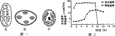 (2)图(二)中,9-10时间因某环境因素突然改变而使光合速率发生相应变化,则引起变化的环境因素是_________;10h时后不再产生ATP的细胞器是[ ] _________,此时[ ] _________成为ATP合成的唯一细胞器。