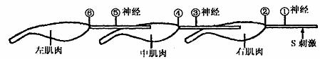 29.已知肌肉受到刺激会收缩,肌肉受刺激前后肌细胞膜内外的电位变化和神经纤维的电位变化一样。取三个新鲜的神经--肌肉标本,按下图连接,图中②、④、⑥指的是神经纤维与肌细胞之问的接头,此接头与突触结构类似。刺激③可引起右肌肉收缩,中肌肉和左肌肉也随后相继收缩。现直接刺激⑤,则会引起收缩的肌肉是 ( )