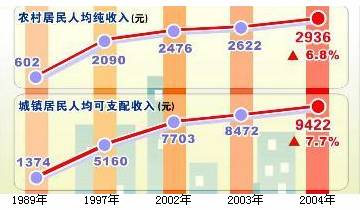 (1)表1反映了1989年至2003年我国城乡居民家庭恩格尔系数都有所下降,2004年都有所上升。表2反映了1989年以来我国农村居民人均纯收入和城镇居民人均可支配收入持续增长。表1、表2都反映出我国城乡居民的生活水平都有提高,消费结构在改善,但城乡差距较大,存在二元经济结构。