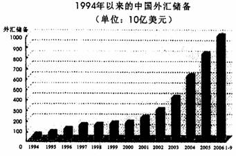 如图所示,截至2006年9月,我国的外汇储备已突破万亿美元。外汇储备的高速增长( )