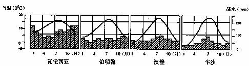 材料三:欧洲四地各月气温与降水分配示意图。