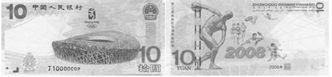 2008年7月8日,中国人民银行发行的第29届奥林匹克运动会纪念钞(纪念钞正面主景图案为北京2008年奥林匹克运动会主会场一国家体育场,其上方为第29届奥林匹克运动会会徽图案,背景为天坛图案),是世界上第一张奥运题材的纸币,也是到目前为止发行量最少的纪念钞,仅为600万张。各地销售火爆,目前市场价已飙升到千元左右。