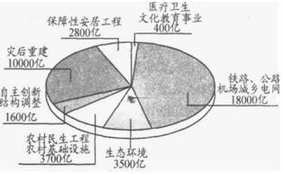 31.发端于美国的次贷危机已演变成全球金融危机,并对世界经济产生了巨大冲击。受国际金融危机快速蔓延和世界经济增长明显减速的影响,我国经济发展面临着来自国际,国内的严重困难和严峻挑战。面对严峻的形势,为了保持国民经济长期稳定发展,2008年11月9日国务院出台了十项措施,总投资约需4万亿元。这是党中央.国务院审时度势,从我国具体国情出发,果断应对国际金融危机的重大举措。下图是4万亿投资投向结构图。