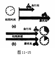 6.图11-15中,(a)、(b)两图分别表示比较自行车和摩托车运动快慢的两种方法.(题型一)