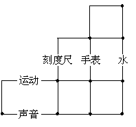 参与组合的物体就像是数轴中的数字一样,每两个数字相交于一点,每两个物体都可以进行组合.举例说明:小明运用“二元坐标法”对“刻度尺、手表、水、声音、运动”这五个词语进行组合,他画出联想图如图11-20.