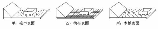 将木板平放在水平桌面上,斜面放在木板一端,在木板表面分别铺上毛巾、棉布,将小车放在斜面顶端,让它自由下滑,观察它在毛巾表面、棉布表面、木板表面上滑过的距离,进行比较.装置如图11-25所示,需要注意的是,每次小车下滑前都要保证初始位置是在斜面顶部.这样小车在平面上运动的初速度才能相同,实验结果才有可比性.