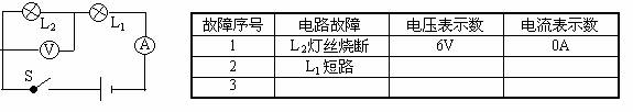 后,两灯均正常发光。在某时刻,电路出现故障。电流表和电压表的示数出现异常。造成该现象的电路故障有多种可能,如下表中1、2所列故障。请分析写出可能出现的第三种由电灯引起的故障(其中一盏灯完好),并填上与2、3对应的电流表和电压表的大约示数。
