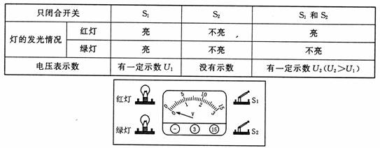 15、小马有一个电路盒,面板(如图13-5-12)上有红、绿灯各一只,两个开关S:、S:,一个电压表.