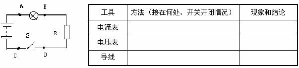 的情况下,请你先后用一个电压表、一个电流表、一根导线三种不同工具分别对故障进行判断,把方法和判断结果填入下表中(每种工具各填写一种方法)。