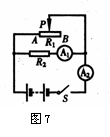 如图7所示,R1为0-200Ω的变阻器,R2=50Ω,电源电压为20V,电流表的量程A1是0-0.6A,电流表A2的量程是0-3A.合上S,当滑动变阻器的滑片位于R1的中点时,