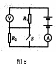 11.如图8,当S闭合时,电流表的示数1.5A,电压表的示数为9V.求(1)求电源电压和R1的阻值;(2)当S断开时,电压表的示数为6V,电流表的示数为1A,R2的阻值是多大?