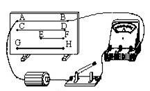 如下图所示,将导线AB(这时的导线相当于用电器)连入右图所示的电路,闭合开关,读出电流表的示数;再将导线CD代替AB,接通电路,读出电流表的示数,我们发现两次示数不同。