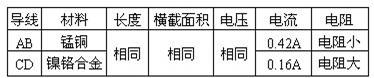 由控制变量法的思路,要研究电阻与材料的关系,就要保持长度和粗细相同。所以我们选择的是AB和CD。分别将它们接入电路中(电源的电压相同),测出流过它们的电流并填入下表中。比较电流的大小,从而得出结论。