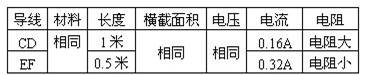我们选择的导体是CD和EF,因为它们具有相同的材料和粗细。分别将它们接入电路中(电源的电压相同),测出流过它们的电流,填入下表中。比较电流的大小,从而得出结论。