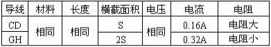 我们选择的导体是CD和GH。因为它们材料相同、长度相同。分别将它们接入电路中(电源的电压相同),测出流过它们的电流,填入下表中。比较电流的大小,从而得出结论。