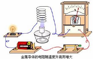 把铁丝线圈按上图所示接入电路,用酒精灯缓慢地对灯丝加热,观察加热前后,演示电流表的示数有什么变化。我们发现随着温度的升高,电流表的示数越来越小。导体被加热后,它的温度升高,电流表示数变小,表明导体的电阻变大,这说明导体的电阻还跟温度有关,对大多数导体来说,温度越高电阻越大。