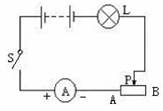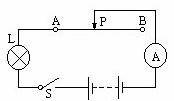 我们还可以做这样一个实验:将一根较长的镍铬合金电阻线AB、小灯泡、电源、开关和演示电流表按图所示电路串联起来,其中P是金属夹制成的触头,当P向左滑动时,电流表示数逐渐变大,灯逐渐变亮;P向右滑动时,电流表示数逐渐变小,灯逐渐变暗。